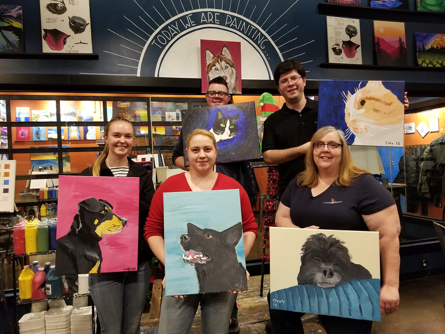 | Our end of year holiday party included dinner and then some of us went to paint our pets at Muse Paint Bar across the river. More of our talents! Emily, Justin, Eddie, Tatiana & Christy | ||||